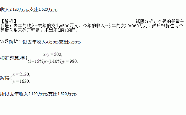 收入2 120万元,支出1 620万元 【解析】试题分析:本题的等量关系是:去年的收入-去年的支出=500万元.今年的收入-今年的支出=960万元.然后根据这两个等量关系来列方程组,求出未知数的解. 试题解析:设去年收入x万元,支出y万元, 根据题意,得 解得 所以去年收入2 120万元,支出1 620万元.