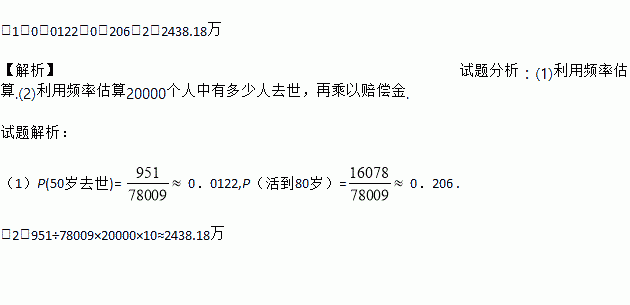 (1)0.0122、0.206(2)2438.18万 【解析】试题分析:(1)利用频率估算.(2)利用频率估算20000个人中有多少人去世,再乘以赔偿金. 试题解析: (1)P(50岁去世)= 0.0122,P(活到80岁)=0.206 . (2)951÷78009×20000×10≈2438.18万