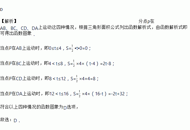如图,正方形ABCD的边长为4,现有一动点P从点A出发,沿A→B→C→D→A的路径以每秒1个单位长度的速度匀速运动,设点P运动的时间为t,△APB的面积为S,则下列图象能大致反映S与t的函数关系的是( )