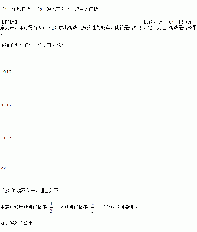 一只不透明的袋子中装有3个球,球上分别标有数字0,1,2,这些球除了数字外其余都相同,甲、以两人玩摸球游戏,规则如下:先由甲随机摸出一个球(不放回),再由乙随机摸出一个球,两人摸出的球所标的数字之和为偶数时则甲胜,和为奇数时则乙胜.