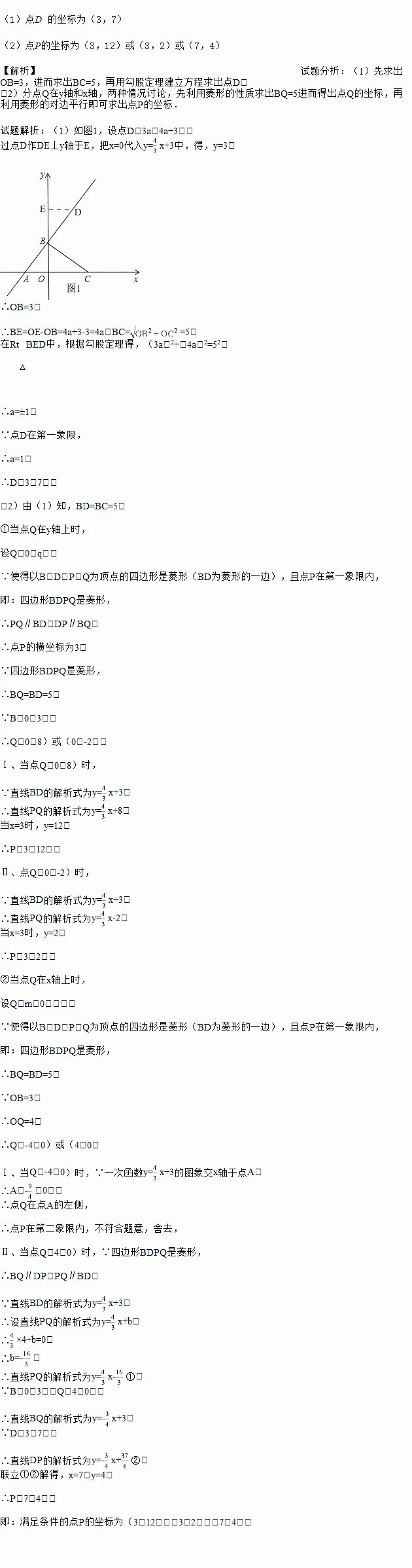 ⑵ 在⑴的条件下,若点Q是坐标轴上的一个动点,试探索在第一象限是否存在另一个点P,使得以B、D、P、Q为顶点的四边形是菱形(BD为菱形的一边)?若存在,请直接写出点P的坐标;若不存在,请说明理由.