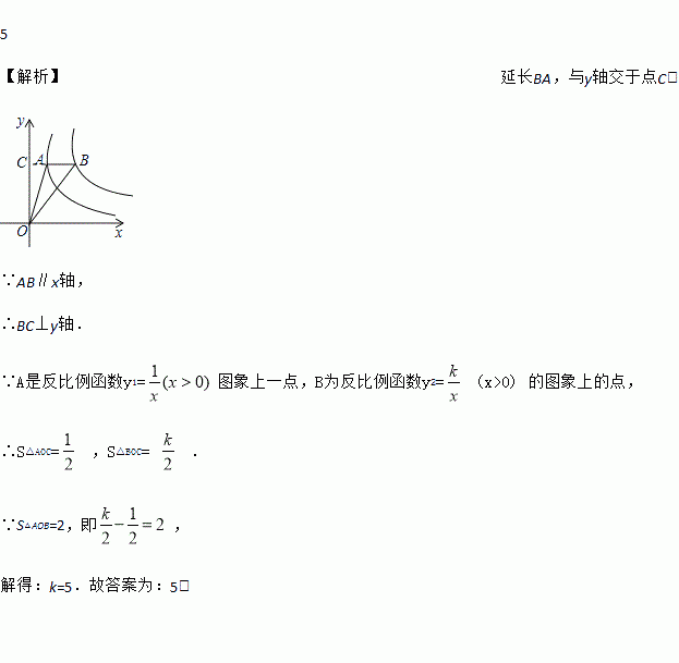 如图,点A是反比例函数(x>0)图象上一点,过点A作x轴的平行线,交反比例函数(x>0)的图象于点B,连接OA、OB,若△OAB的面积为2,则k的值为______.