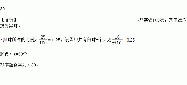 30 【解析】∵共实验100次,其中25次摸到黑球, ∴黑球所占的比例为=0.25,设袋中共有白球x个,则=0.25, 解得:x=30个. 故本题答案为:30.
