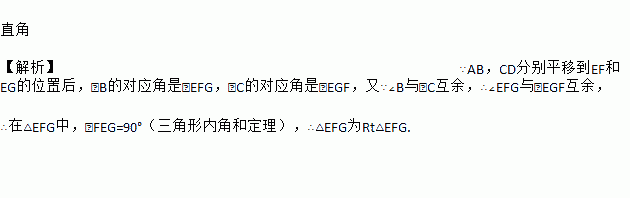 如图,在四边形ABCD中,AD∥BC,BC>AD,∠B与∠C互余,将AB,CD分别平移到EF和EG的位置,则△EFG为________三角形。![]()