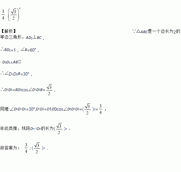 如图,△ABC是一个边长为2的等边三角形,AD0⊥BC,垂足为点D0.过点D0作D0D1⊥AB,垂足为点D1;再过点D1作D1D2⊥AD0,垂足为点D2;又过点D2作D2D3⊥AB,垂足为点D3;……;这样一直作下去,得到一组线段:D0D1,D1D2,D2D3,……,则线段D1D2的长为______,线段Dn-1Dn的长为______(n为正整数).