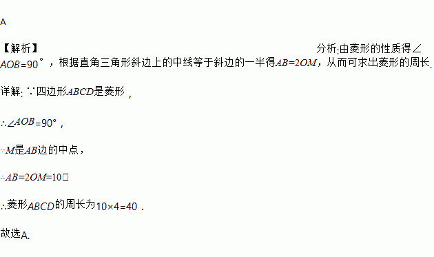 如图,菱形ABCD的一边中点M到对角线交点O的距离为5cm,则菱形ABCD的周长为( )