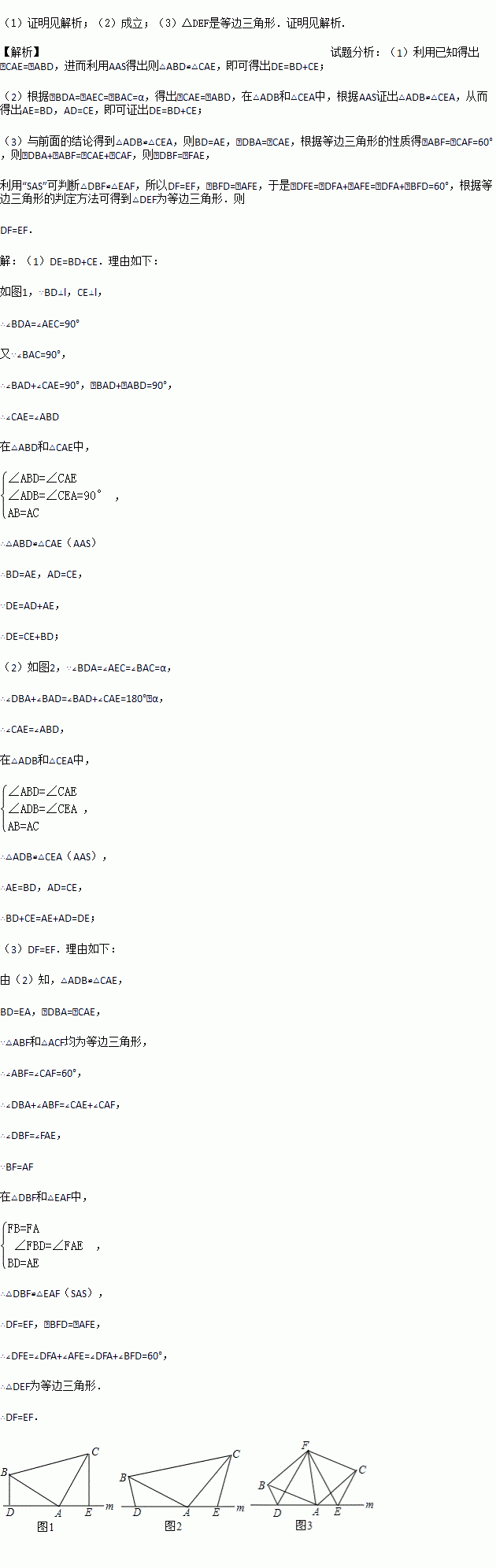 (3)拓展与应用:如图3,D、E是D、A、E三点所在直线m上的两动点(D、A、E三点互不重合),点F为∠BAC平分线上的一点,且△ABF和△ACF均为等边三角形,连接BD、CE,若∠BDA=∠AEC=∠BAC,试判断△DEF的形状.
