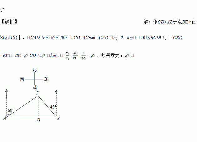 如图,在一笔直的沿湖道路l上有A,B两个游船码头,观光岛屿C在码头 A的北偏东60°方向,在码头B的北偏西45°方向,AC=4 km.游客小张准备从观光岛屿C乘船沿CA回到码头A或沿CB回到码头B,设开往码头A,B的游船速度分别为v1 km/h,v2 km/h,若回到A,B所用时间相等,则
