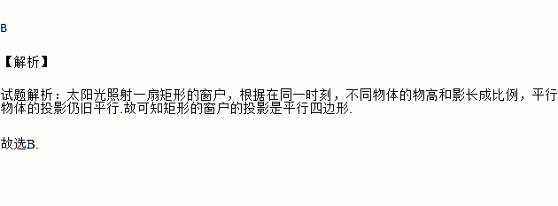 太阳光照射一扇矩形的窗户,投在平行于窗户的墙上的影子的形状是( )