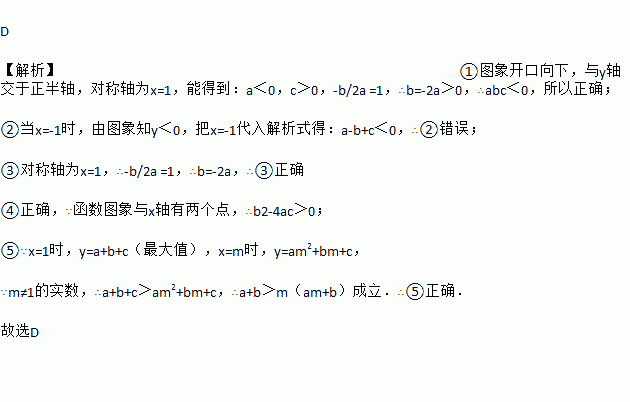 D 【解析】①图象开口向下,与y轴交于正半轴,对称轴为x=1,能得到:a<0,c>0,-b/2a =1,∴b=-2a>0,∴abc<0,所以正确; ②当x=-1时,由图象知y<0,把x=-1代入解析式得:a-b+c<0,∴②错误; ③对称轴为x=1,∴-b/2a =1,∴b=-2a,∴③正确 ④正确,∵函数图象与x轴有两个点,∴b2-4ac>0; ⑤∵x=1时,y=a...