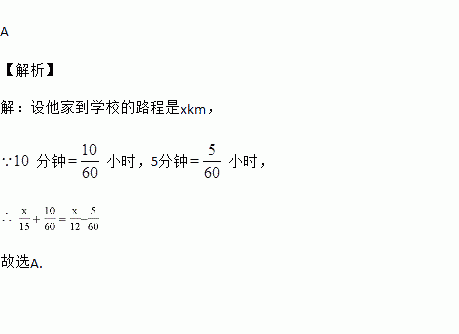 小明从家里骑自行车到学校,每小时骑15km,可早到10分钟,每小时骑12km就会迟到5分钟.问他家到学校的路程是多少km?设他家到学校的路程是xkm,则据题意列出的方程是( )