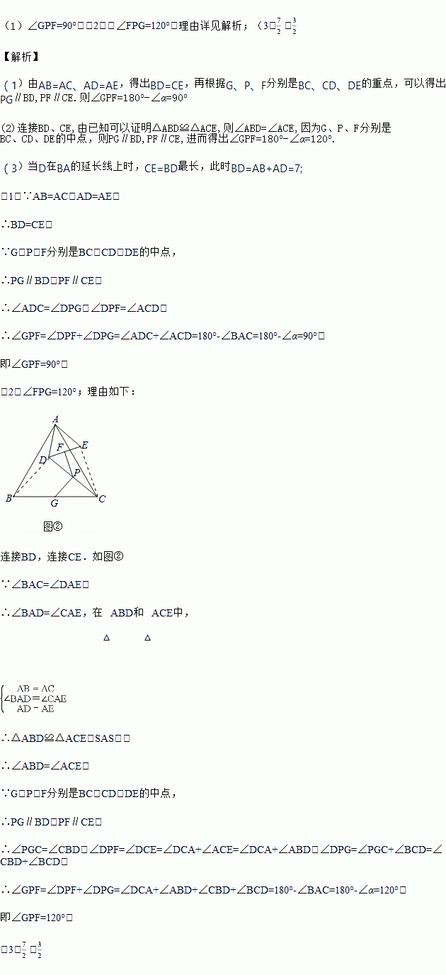 △ABC和△ADE中,AB=AC,AD=AE,∠BAC=∠DAE=α(0°<α≤90°),点F,G,P分别是DE,BC,CD的中点,连接PF,PG.