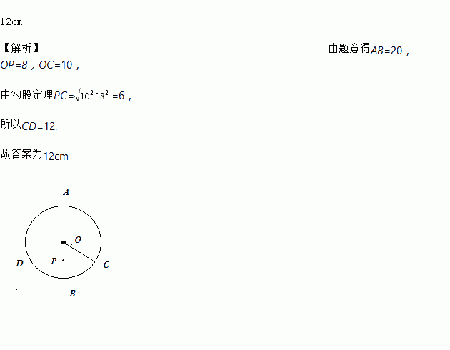P为⊙O内一点,且OP=8 cm,过P的最长弦长为20 cm,则过P的最矩弦长为________.