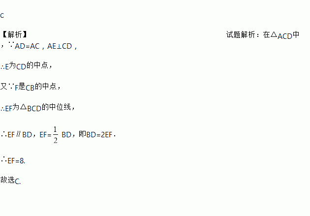 如图,在△ABC中,D是AB上一点,AD=AC,AE⊥CD,垂足为点E,F是BC的中点,若BD=16,则EF=( )