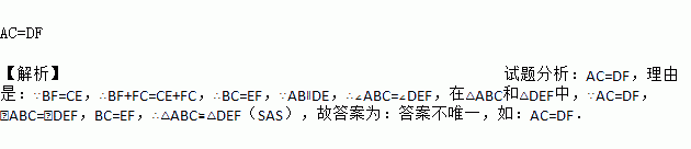 如图,在△ABC和△DEF中,点B、F、C、E在同一直线上,BF=CE,AC∥DF,请添加一个条件,使△ABC≌△DEF,这个添加的条件可以是___________.(只需写一个,不添加辅助线)
