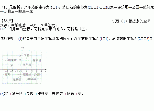 (1)在图中建立平面直角坐标系,并写出汽车站和消防站的坐标;