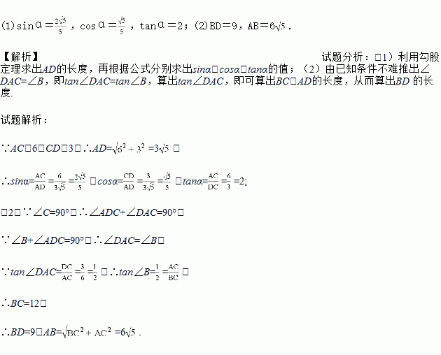 如图,已知在Rt△ABC中,∠C=90°,D是BC边上一点,AC=6,CD=3,∠ADC=α.