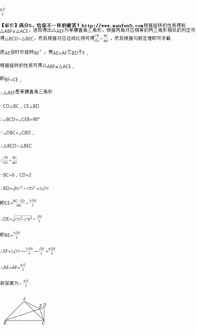 如图,等腰直角△ABC中,∠BAC=90°,BC=6,过点C作CD⊥BC,CD=2,连接BD,过点C作CE⊥BD,垂足为E,连接AE,则AE长为_____.