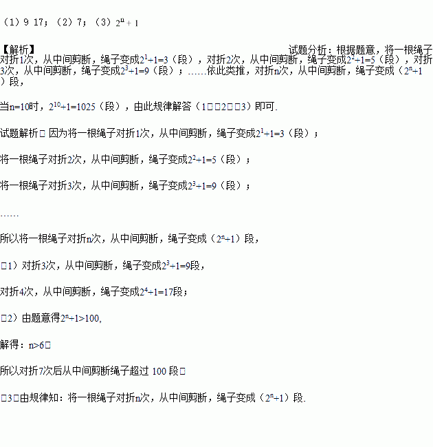 将一根绳子对折 1 次从中间剪断,绳子变成 3 段;将一根绳子对折 2 次,从中