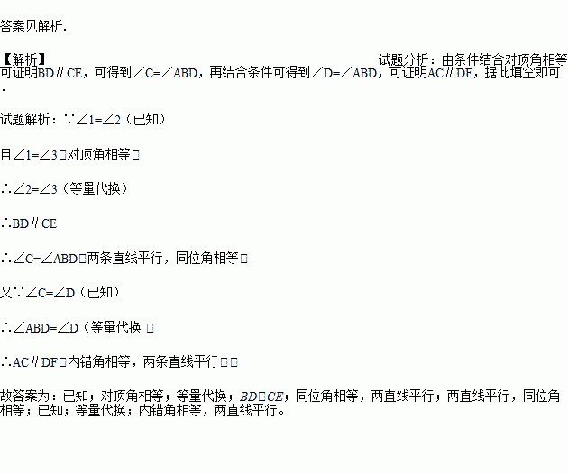 根据题意结合图形填空:如图,点E在DF上,点B在AC上,∠1=∠2,∠C=∠D.试说明:AC∥DF.将过程补充完整.