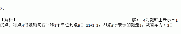 2. 【解析】【解析】 ∵A为数轴上表示﹣1的点,将点A沿数轴向右平移3个单位到点B,∴﹣1+3=2,即点B所表示的数是2,故答案为:2.