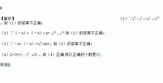 (1)a5+a5=a10,(2)(-a)6·(-a)3·a=a10,(3)-a4·(-a)5=a20,(4)25+25=26