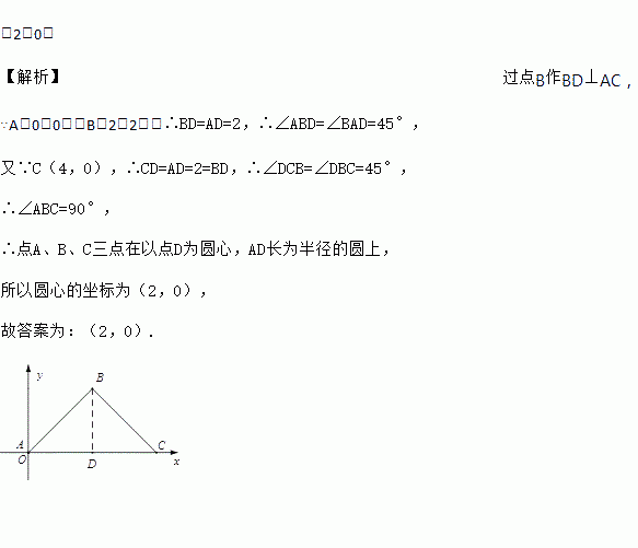 (2,0) 【解析】过点B作BD⊥AC, ∵A(0,0),B(2,2),∴BD=AD=2,∴∠ABD=∠BAD=45°, 又∵C(4,0),∴CD=AD=2=BD,∴∠DCB=∠DBC=45°, ∴∠ABC=90°, ∴点A、B、C三点在以点D为圆心,AD长为半径的圆上, 所以圆心的坐标为(2,0), 故答案为:(2,0).