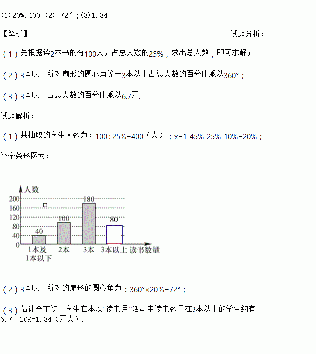 (3)若全市在校初三年级学生有6.7万名,请你估计全市初三学生在本次“读书月”活动中读书数量在3本以上的学生约有________万名.