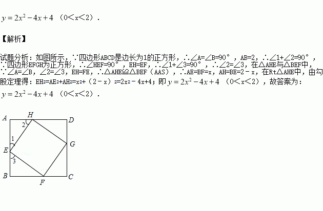 如图,正方形EFGH的顶点在边长为2的正方形的边上.若设AE=x,正方形EFGH的面积为y,则y与x的函数关系为 .