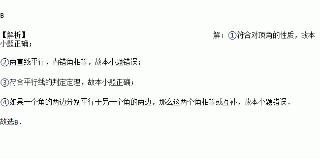 下列四个命题:①对顶角相等;②内错角相等;③平行于同一条直线的两条直线互相平行;④如果一个角的两边分别平行于另一个角的两边,那么这两个角相等。其中真命题的个数是( )