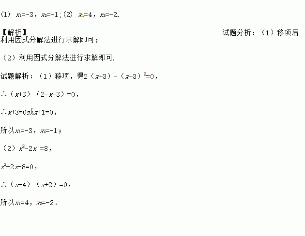 (1) x1=-3,x2=-1;(2) x1=4,x2=-2. 【解析】试题分析:(1)移项后利用因式分解法进行求解即可; (2)利用因式分解法进行求解即可. 试题解析:(1)移项,得2(x+3)-(x+3)2=0, ∴(x+3)(2-x-3)=0, ∴x+3=0或x+1=0, 所以x1=-3,x2=-1; (2)x2-2x =8, x2-2x-8=...