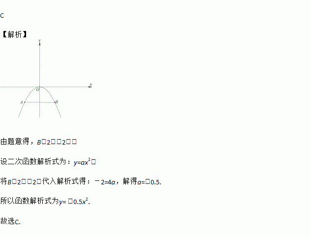 C 【解析】 由题意得,B(2,-2), 设二次函数解析式为:y=ax2, 将B(2,-2)代入解析式得:-2=4a,解得a=-0.5. 所以函数解析式为y= -0.5x2. 故选C.