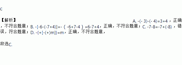 C 【解析】A. -(- 3)-(- 4)=3+4 ,正确,不符合题意;B. -[-6-(-7+4)]=-(-6+7-4)=6-7+4,正确,不符合题意;C. -7-8=-7+(-8) ,错误,符合题意;D. -{+[-(+)m]}=m,正确,不符合题意, 故选C.