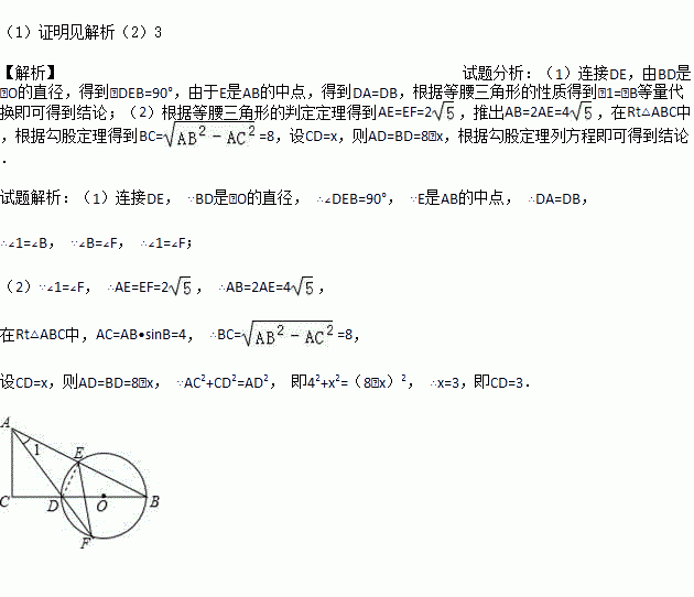 如图,在△ABC中,∠C=90°,D是BC边上一点,以DB为直径的⊙O经过AB的中点E,交AD的延长线于点F,连接EF.