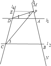 £¨3£©¢Ù¹ýP×÷PE¡ÎAD£®½»Ö±Ïßl4ÓÚE£¬ÍƳöPE¡ÎÖ±Ïßl1¡Îl2£¬¸ù¾ÝƽÐÐÏßµÄÐÔÖʵóö¡ÏEPD=¡Ï1£¬¡ÏEPC=¡Ï3£¬¼´¿ÉµÃ³ö½áÂÛ¡Ï2=¡Ï3-¡Ï1£»¢Ú¸ù¾ÝƽÐÐÏßµÄÐÔÖʼ´¿ÉÍÆ³ö´ð°¸£®