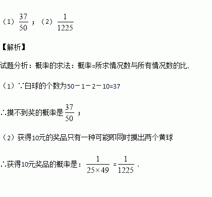 学校门口经常有小贩搞摸奖活动.某小贩在一只黑色的口袋里装有只有颜色不同的50只小球,其中红球1只,黄球2只,绿球10只,其余为白球.搅拌均匀后,每2元摸1个球.奖品的情况标注在球上(如下图)