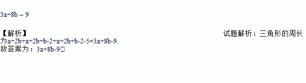 3a+8b – 9 【解析】试题解析:三角形的周长为a+2b+a+2b+b-2+a+2b+b-2-5=3a+8b-9. 故答案为:3a+8b-9.