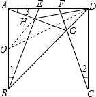 1.分析 根据正方形的性质可得AB=AD=CD,∠BAD=∠CDA,∠ADG=∠CDG,然后利用“边角边”证明△ABE和△DCF全等,根据全等三角形对应角相等可得∠1=∠2,利用“SAS”证明△ADG和△CDG全等,根据全等三角形对应角相等可得∠2=∠3,从而得到∠1=∠3,然后求出∠AHB=90°,取AB的中点O,连接OH、OD,根据直角三角形斜边上的中线等于斜边的一半可得OH=$\frac{1}{2}$AB=1,利用勾股定理列式求出OD,然后根据三角形的三边关系可知当O、D、H三点共线时,DH的长度最小.