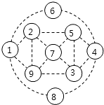 请把1~9的九个自然数分别填入上图中的九个小圆里,使三个“正方形”及一个“大圆”(图中由虚线围成)上四个数字之和分别都等于19.(注:一种填法即可,不必考虑所有填法)________.