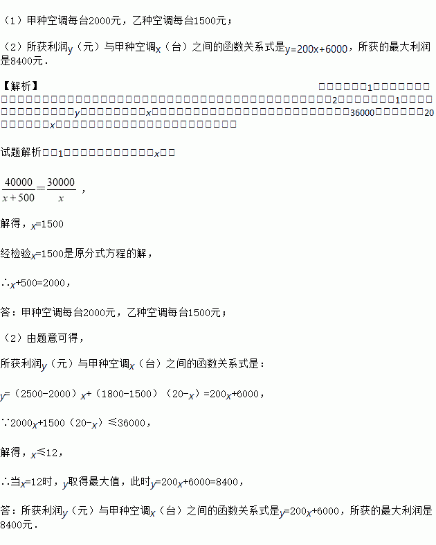 (1)甲种空调每台2000元,乙种空调每台1500元; (2)所获利润y(元)与甲种空调x(台)之间的函数关系式是y=200x+6000,所获的最大利润是8400元. 【解析】试题分析:(1)根据题意可以列出相应的方程,从而可以分别求得甲、乙两种空调每台的进价,注意分式方程要检验;(2)根据题意和(1)中的答案可以得到所获利润y(元)与甲种空调x(台)之间的函数关系式,然后根据商场计划...