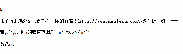 (k1•k2≠0)的图象如图所示,若y1>y2,则x的取值范围是( )