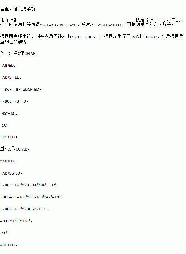 如图,AB∥ED,∠B=48°,∠D=42°,BC垂直于CD吗?下面给出两种添加辅助线的方法,请选择一种,对你作出的结论加以说明.