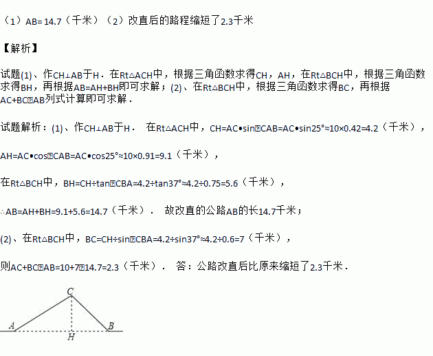 如图,从A地到B地的公路需要经过C地,图中AC=10千米,∠CAB=25°,∠CBA=37°。因城市规划的需要,将在A,B两地之间修建一条笔直的公路。