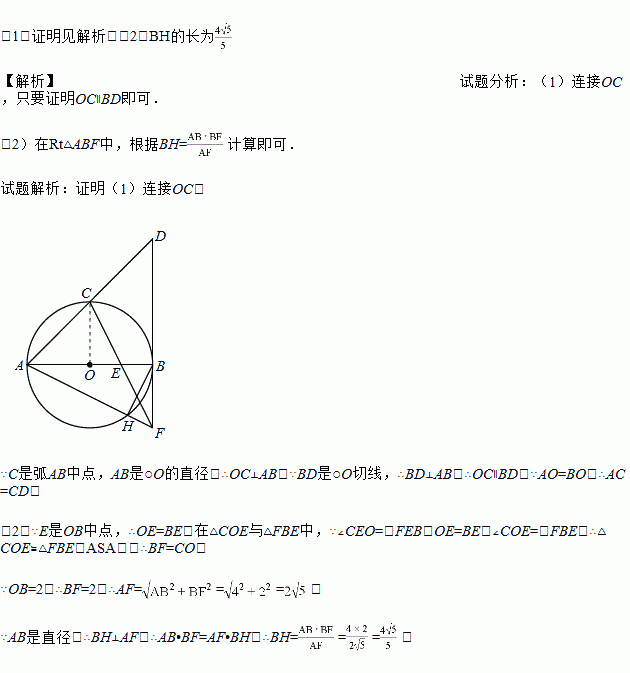 (2)若OB=2,求BH的长.