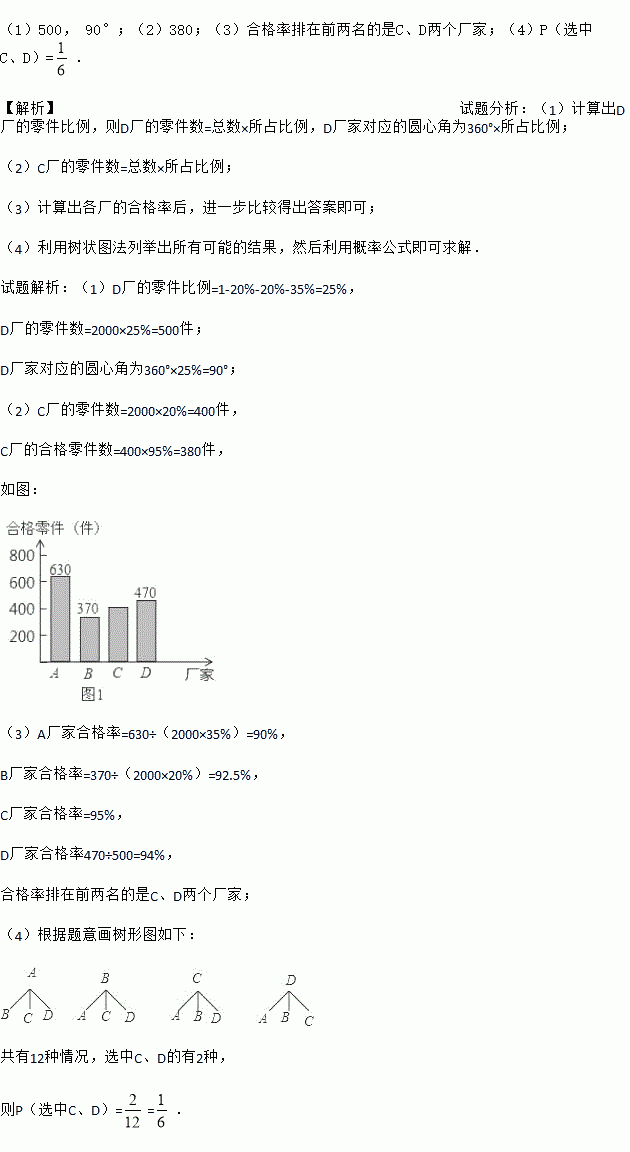 为响应国家的“一带一路”经济发展战略,树立品牌意识,我市质检部门对A、B、C、D四个厂家生产的同种型号的零件共2000件进行合格率检测,通过检测得出C厂家的合格率为95%,并根据检测数据绘制了如图1、图2两幅不完整的统计图.