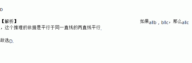 D 【解析】如果a∥b,b∥c,那么a∥c,这个推理的依据是平行于同一直线的两直线平行. 故选D.