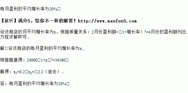 小王去年开了一家微店,今年1月份开始盈利,2月份盈利24000元,4月份盈利达到34560元,且从2月份到4月份,每月盈利的平均增长率相同.试求每月盈利的平均增长率.