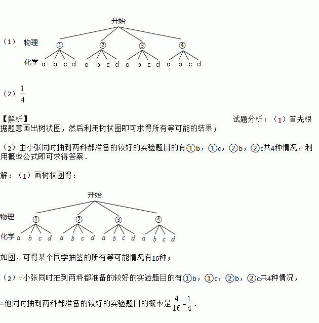 (2)小张同学对物理的①、②和化学的b、c号实验准备得较好,他同时抽到两科都准备的较好的实验题目的概率是多少?