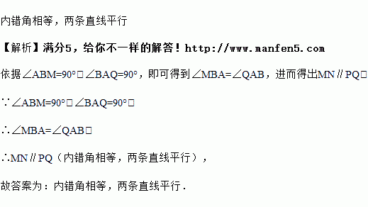 如图是一块四边形木板和一把曲尺(直角尺),把曲尺一边紧靠木板边缘PQ,画直线AB,与PQ,MN分别交于点A,B;再把曲尺的一边紧靠木板的边缘MN,移动使曲尺另一边过点B画直线,若所画直线与BA重合,则这块木板的对边MN与PQ是平行的,其理论依据是_________.