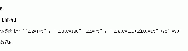 B. 【解析】 试题分析:∵∠2=105°,∴∠BOC=180°-∠2=75°,∴∠AOC=∠1+∠BOC=15°+75°=90°. 故选B.